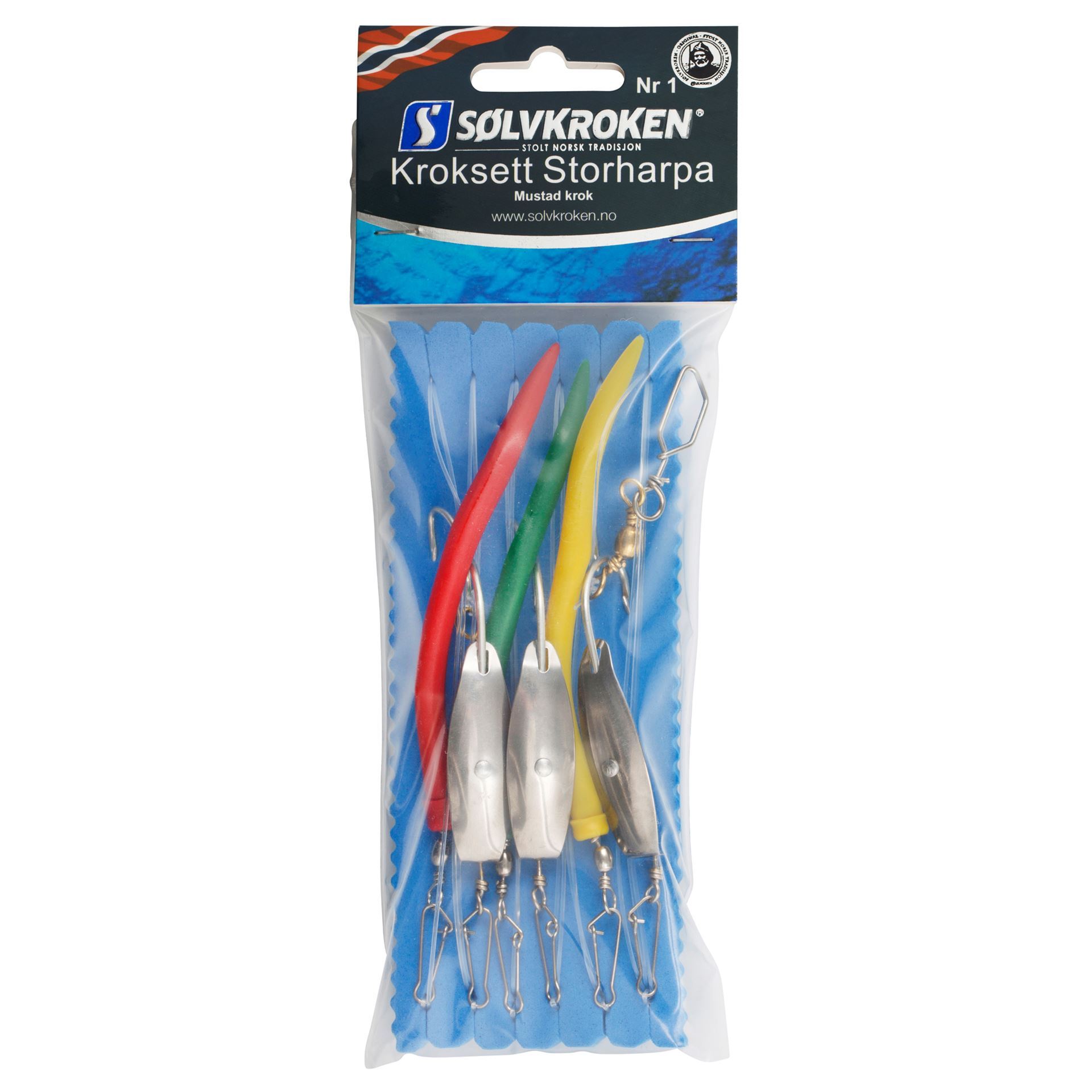 Sølvkrokens harpekroksett er utviklet for norske forhold. Ferdig knyttede kroksett med gummimark og rykk. Alle leveres på skumplate og er svært enkle å montere.